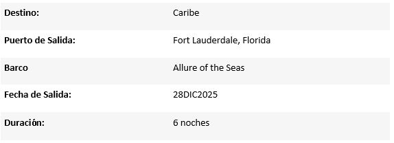 * Royal Caribbean se reserva los derechos de modificar, alterar y cambiar información, sin previo aviso. Itinerarios pueden variar.