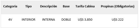 Condiciones de la tarifa Non Ref (No reembolsable): Si se anula la reserva antes de la fecha de pago final, no se reembolsará el depósito. Se aplicará un fee de US$ 100 por persona por cada cabina.