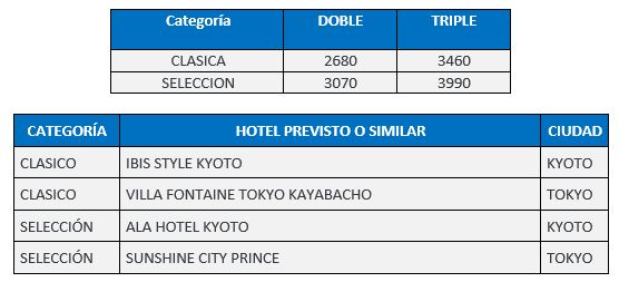- El traslado de llegada a Tokyo, está sujeto a horarios de transporte público. En caso de llegar entre las 22:00 y las 06:30am, el traslado tendrá un suplemento de US$165 neto por pax.