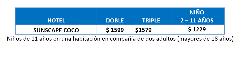 - Tarifas sujetas a variación sin previo aviso según disponibilidad de espacios, disponibilidad de tarifa, o variación de tarifa de proveedores, al momento de realizar las reservas.