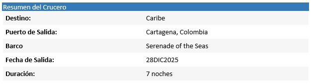 Serenade of the Seas®, un barco de ensueño elegante y luminoso, con vistas panorámicas y espacios abiertos en cada rincón. Ofrecerá viajes de siete noches por el sur del Caribe a Aruba, Curazao y Colón, una variedad de experiencias, espacios de relajación, y diferentes opciones para comer, beber y diversión para pasajeros de todas las edades.