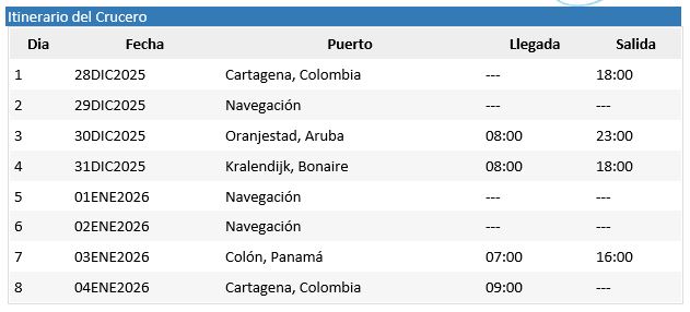 - Requisitos: Pasaporte válido seis meses desde el día final de navegación, visas de acuerdo a itinerario y nacionalidad