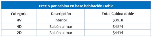 Precios POR CABINA – INCLUYE IMPUESTOS PORTUARIOS, PROPINAS Y PAQUETE DE BEBIDAS