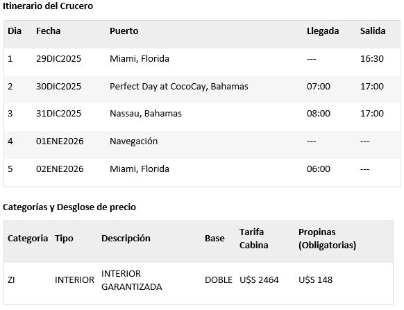 - Propinas: $18.50 por persona por noche / Gran Suite o superior $21.00 por persona por noche.